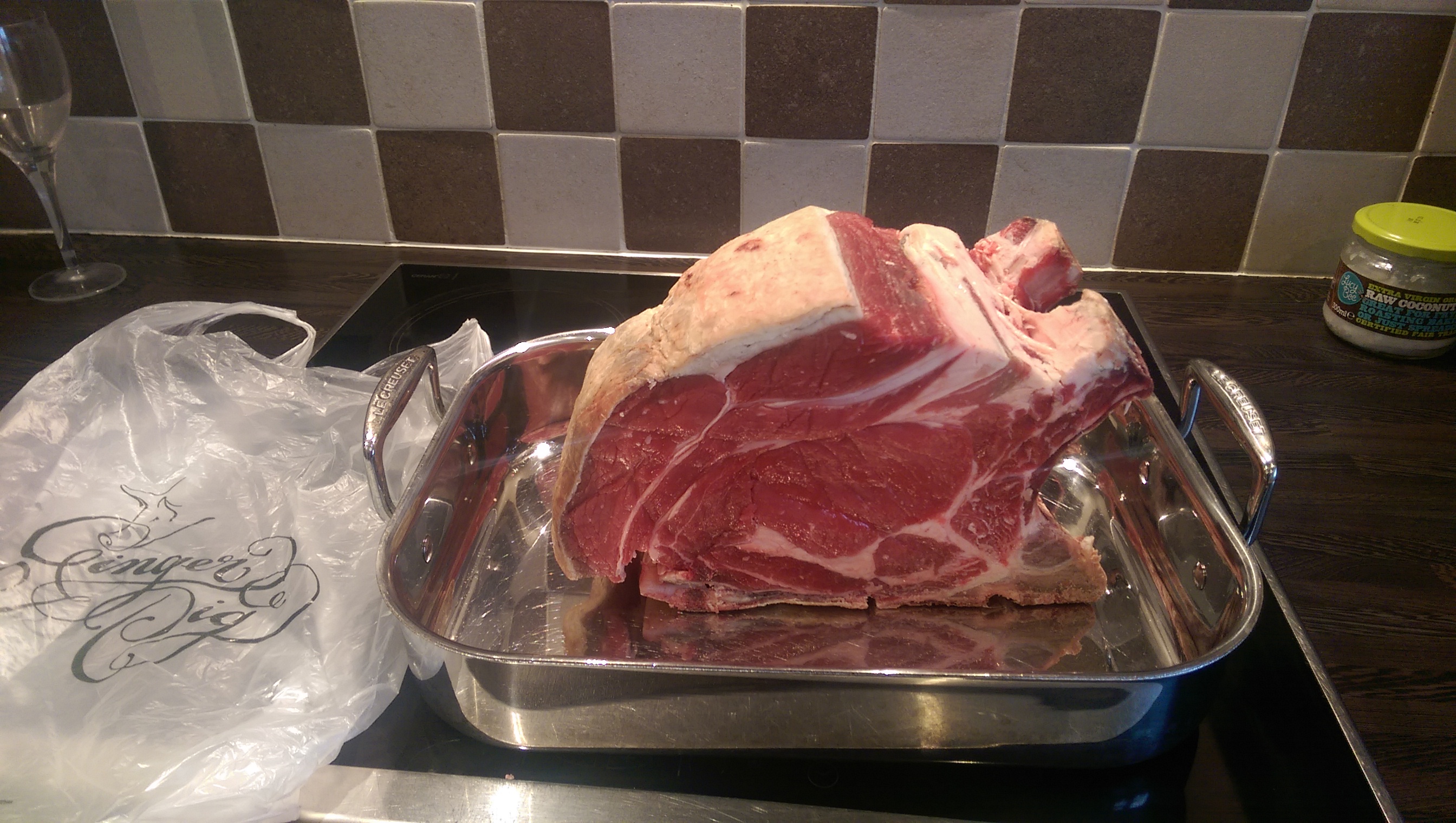 Ultra-low temperature roasting gently raises the temperature of the meat over several hours to the minimum level that will cook the meat and kill any bacteria – 60 C – but makes maximum use of the meat’s own enzymes to tenderise the protein and retain flavour. I used a Ginger Pig fore-rib of beef and, as this was from Ginger Pig, the animal was large and so a 2-bone rib was way more than enough for 4. Here is the joint…
