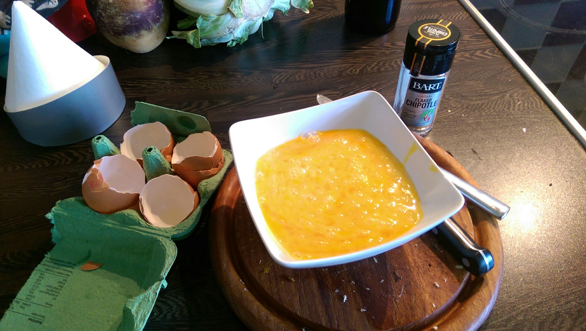 I take a small amount of finely diced onion or shallot and some grated fresh ginger and fry it off in a good fat with chilli flakes and turmeric. I rummage through the vegetables in the fridge and see if there are any that will go in – a tomato often makes it but beans and leftover bits of peppers have made an appearance too. I then find some leftover over cooked meat, dice it small and mix it in. I have used everything you could think of steak, sausage, burger, roast pork, roast chicken. Whatever.