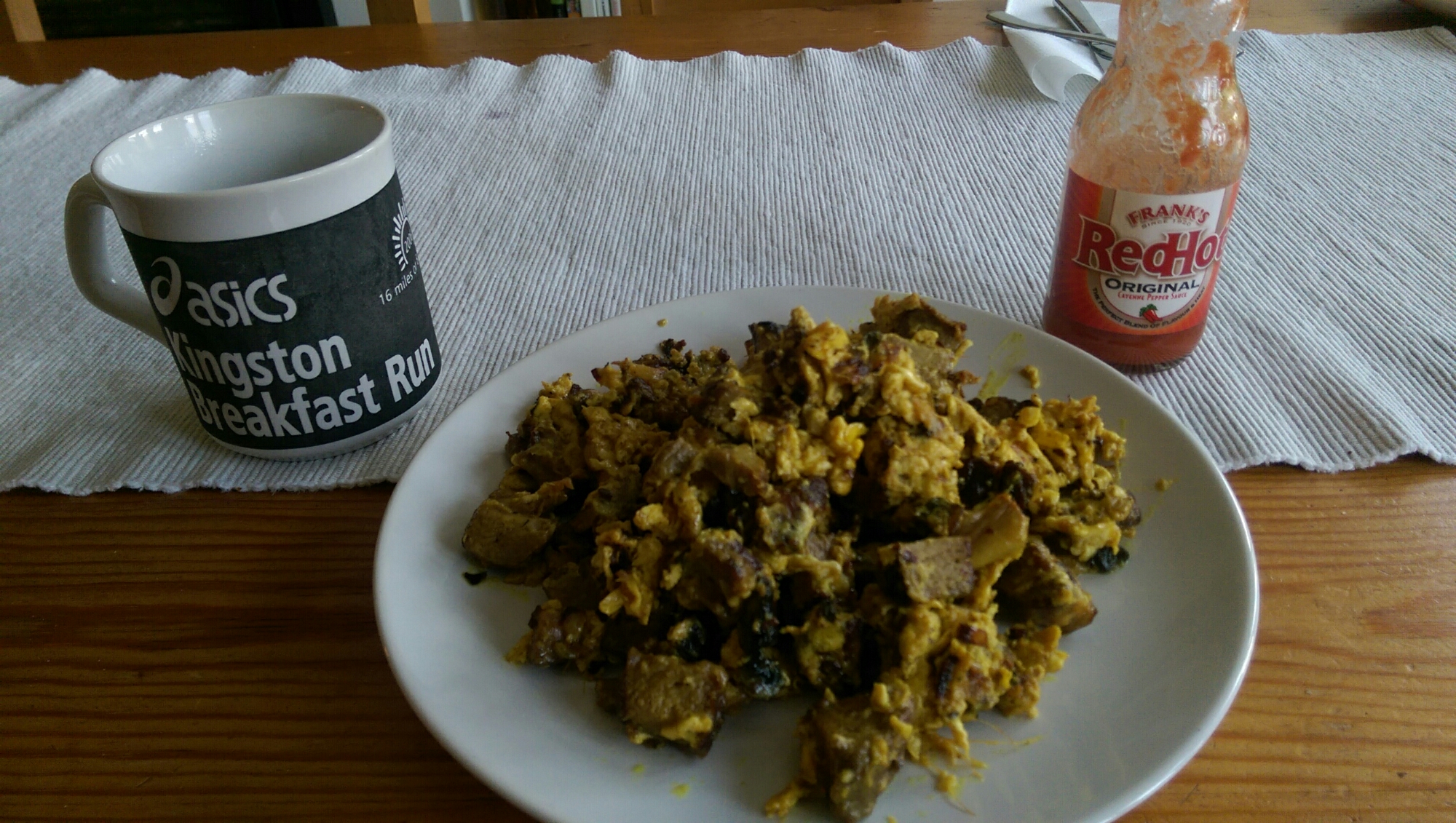 Then, as the contents of the pan heat up, I crack open some eggs and mix them up. I add a really good lump of butter to the pan and when it has melted, I scramble the eggs in the pan with all its contents. I season on the plate and eat it with a hot sauce. Messy but so good. Perfect after a cold early morning workout.